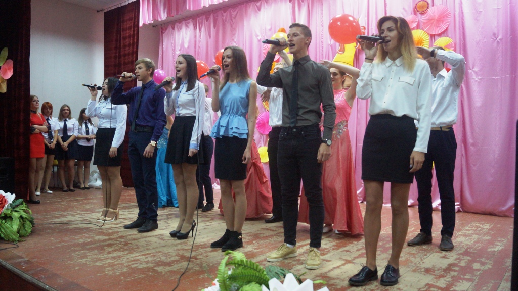 Затем праздник продолжился в актовом зале. Зал украшен оформленными к этому событию праздничными гирляндами шаров, огромным звонком-колокольчиком, веерными кругами. Все украшения выполнены самостоятельно студентами гр.ДК-31.